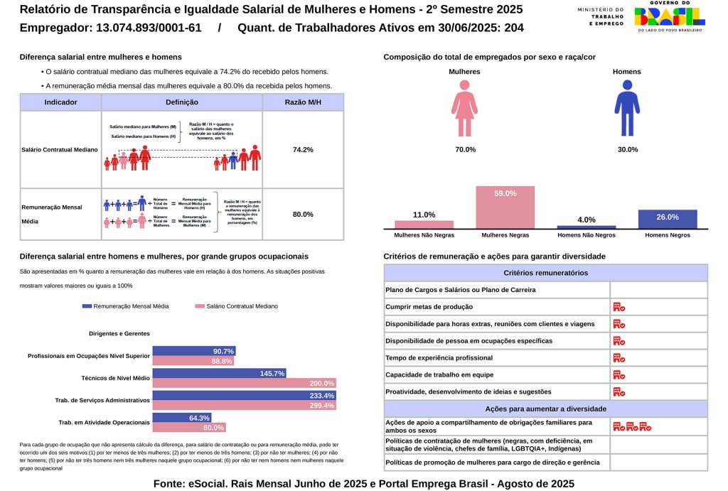 Emprega Brasil disponibilizou o relatório com informações sobre a transparência salarial e de critérios remuneratórios, conforme a Lei de Igualdade Social. A iniciativa busca garantir a igualdade salarial entre homens e mulheres levando em conta parâmetros como transparência salarial, fiscalização contra a discriminação e apoio à capacitação de mulheres. Confira os dados do relatório.